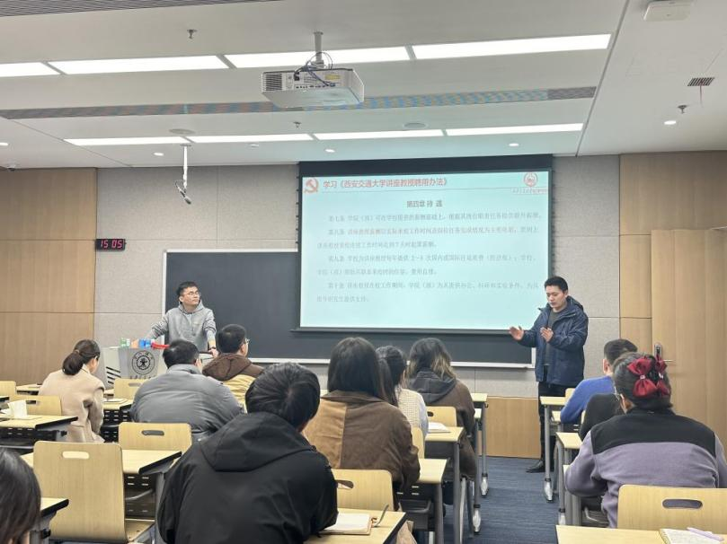 会议第五项,学习《西安交通大学讲座教授聘用办法》。支部书记成一龙老师带领学习《西安交通大学讲座教授聘用办法》,成一龙老师从聘用条件、岗位职责、聘用程序、待遇以及管理与考核五个方面进行了详细介绍,并鼓励支部成员邀请行业专家前来交流,提升学院科研影响力,为学院以及支部发展贡献自己的一份力量。